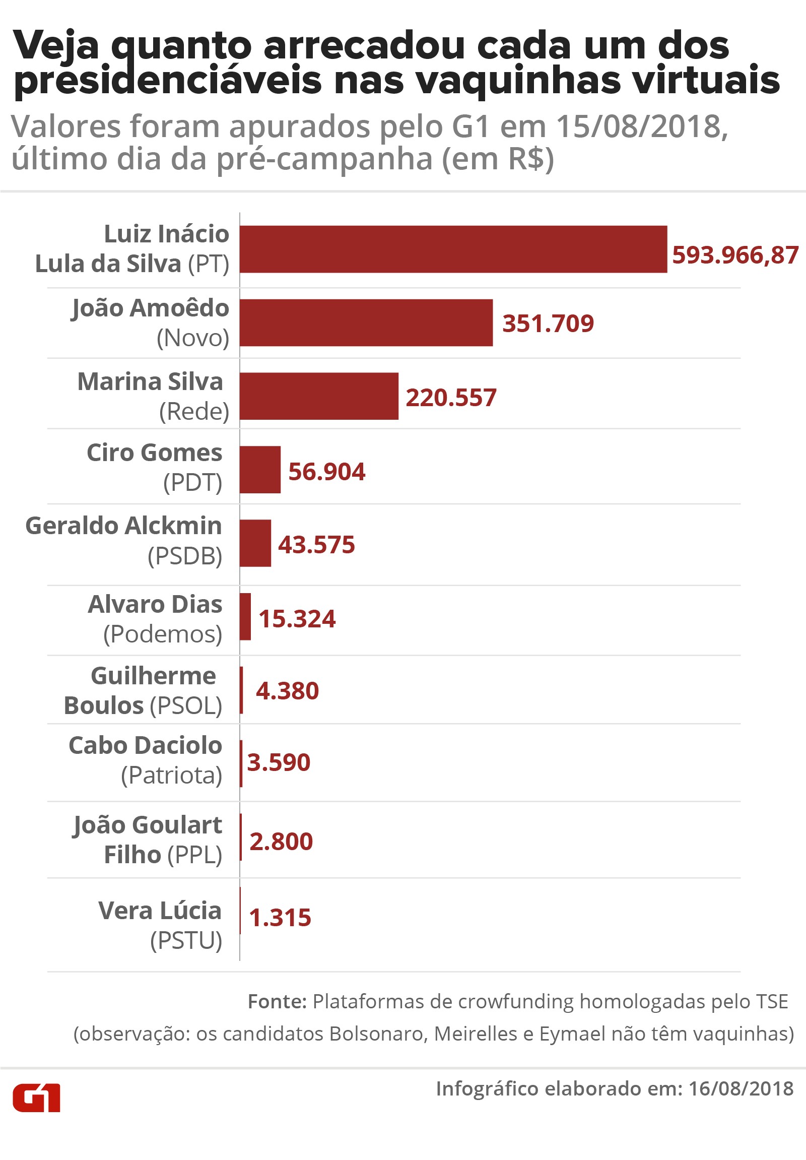 O G1 apurou nesta quarta-feira – último dia da pré-campanha – o valor obtido pelos candidatos à Presidência nas nove plataformas online homologadas pelo TSE que organizam financiamentos coletivos para os presidenciáveis.